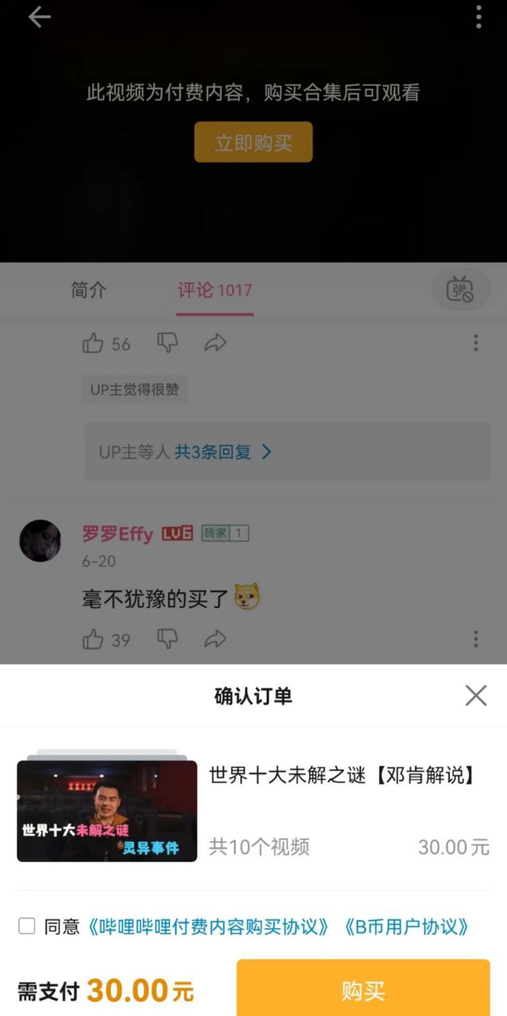 据了解,6月20日B站UP主@勾手老大爷邓肯 上传了“世界十大未解之谜”系列视频,成为哔哩哔哩全站首个付费视频合集。经查看,目前付费视频暂不支持在PC端观看,在APP上显示需要花费30元购买系列视频,共10个视频平均每个视频花费为3元,且目前合集仅更新了一集。