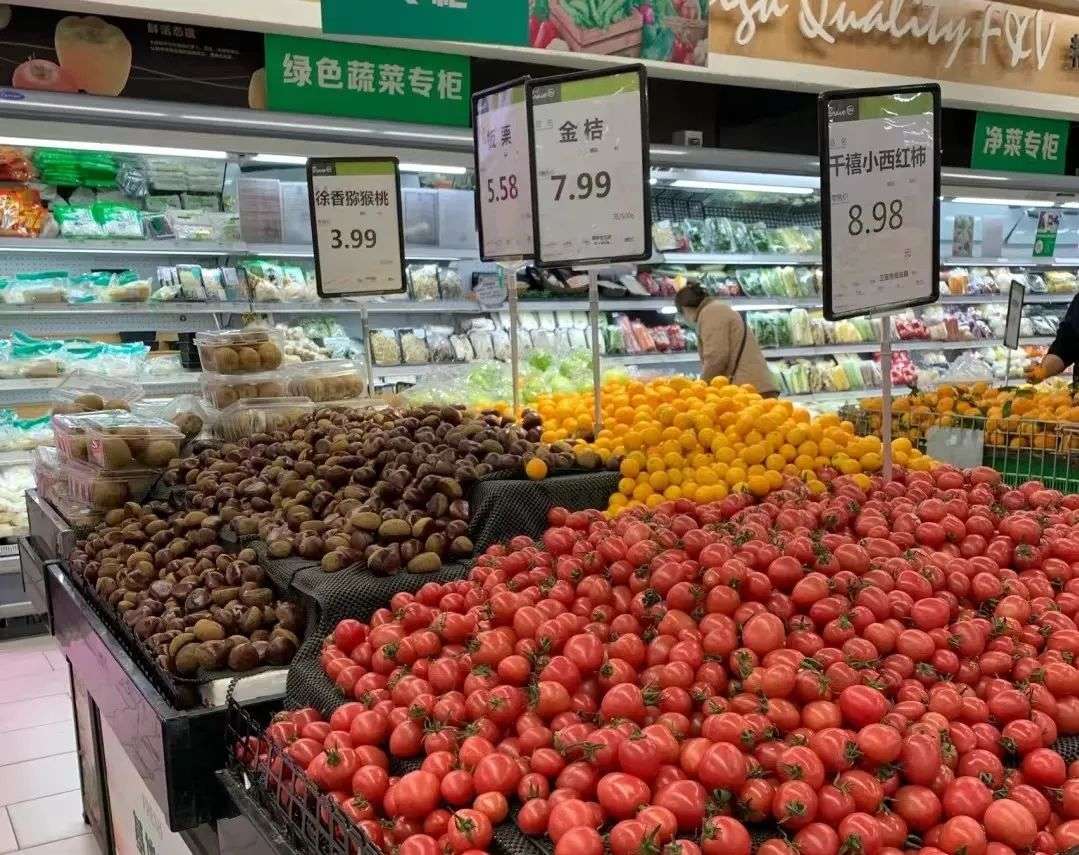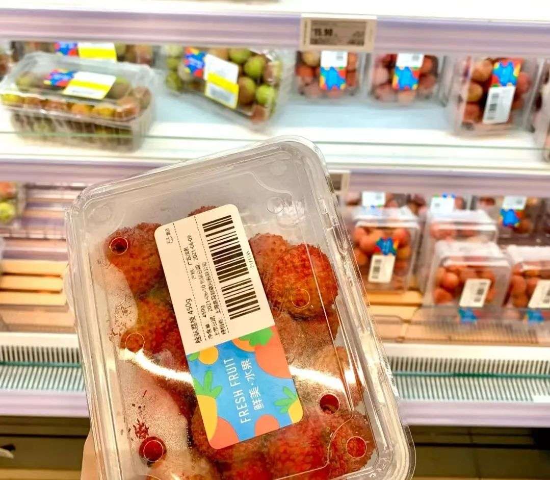 货架的绿色“瓜田”上,被一分两半的西瓜露出红色瓜瓤,讲述着红配绿的经典审美,再往前走,是黄色的柠檬,她拿起一颗凑近了闻,酸甜的清爽感扑面而来,之后是荔枝,柔媚的香甜透过深红的果壳若有若无地传来。