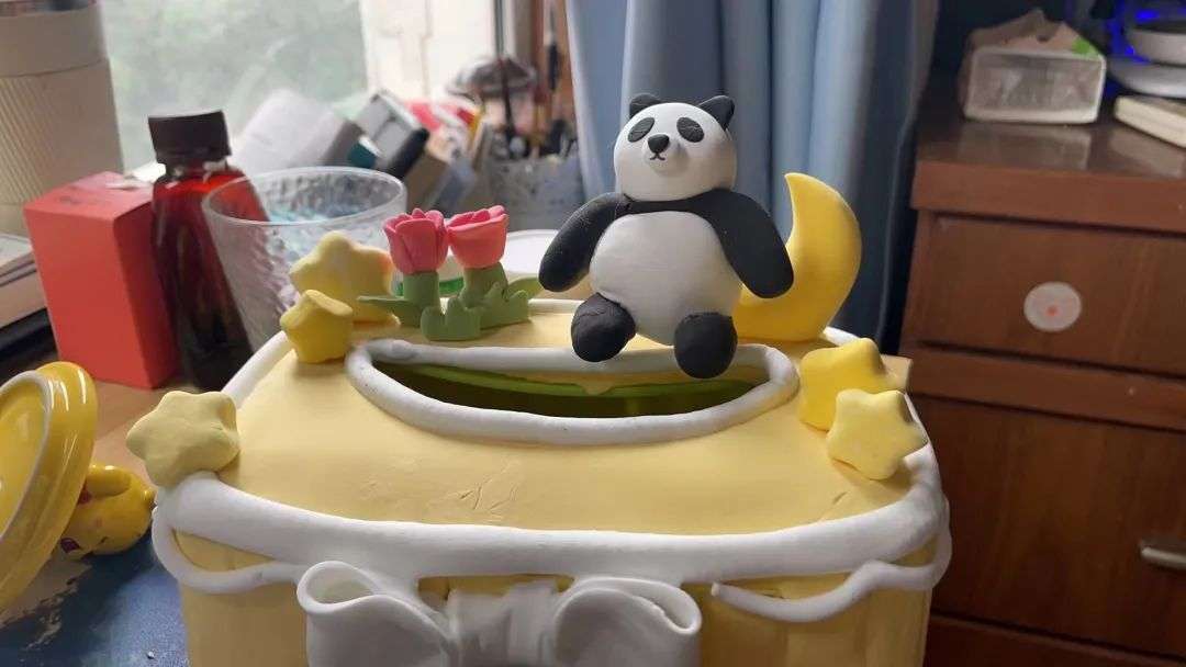 在粘土的过程中,偶然抬头的山吹觉得餐桌上的白色纸巾盒不好看。于是,两个小时后,纸巾盒变成了明媚的黄色,上边还被摆放着玫瑰花、月亮、星星和一只大熊猫,那是山吹用超轻黏土给纸巾盒做的新衣服。