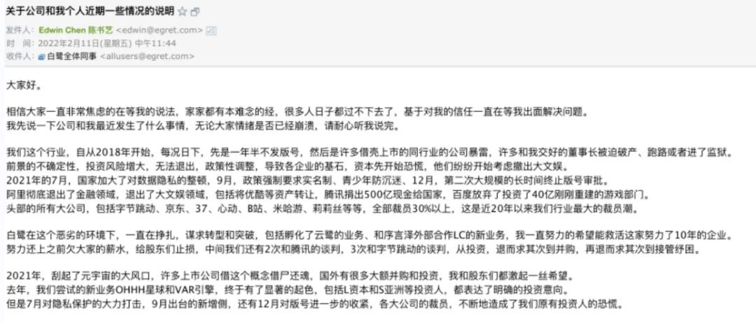 近期,陈书艺通过内部信的形式介绍了白鹭科技的现状:背后 26 家股东刁难;作为创始人,已经卖了车和股票,抵押了房子,举债 4000 万;公司正等待破产清算……
