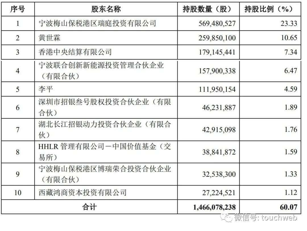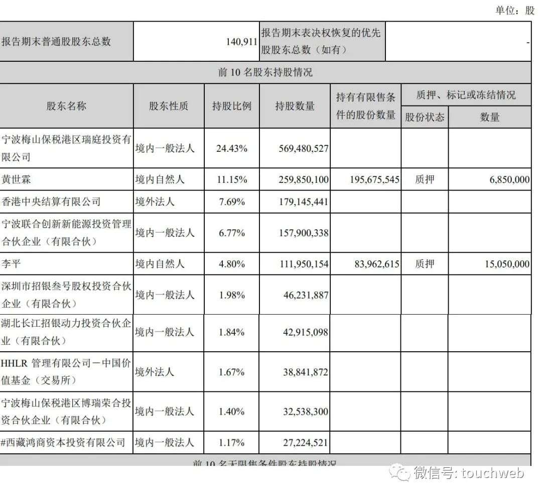 截至2022年3月31日,宁波梅山保税港区瑞庭投资有限公司持股为24.43%,黄世霖持股为11.15%,香港中央结算有限公司持股为7.69%,宁波联合创新新能源投资管理合伙企业(有限合伙)持股为6.77%;