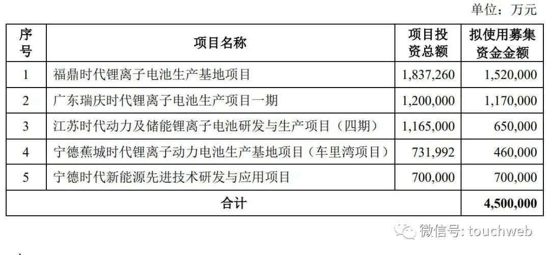 宁德时代此次募资有5大用途,其中,152亿元用于福鼎时代锂离子电池生产基地项目,117亿元用于广东瑞庆时代锂离子电池生产项目一期,65亿元用于江苏时代动力及储能锂离子电池研发与生产项目(四期),46亿元用于宁德蕉城时代锂离子动力电池生产基地项目(车里湾项目),70亿元用于宁德时代新能源先进技术研发与应用项目。