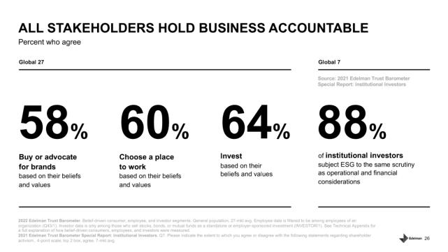 投资者、消费者和员工对ESG的热情会受社会形势、ESG形势的影响而变化,领导人要接受这一点。只要你的ESG策略有利于公司发展,不被大环境看好时也要咬牙坚持。爱德曼2022年信任晴雨表报告(Edelman 2022 Trust Barometer)里写过,即使在经济困难时期,投资者仍然青睐关注社会责任的品牌和公司。