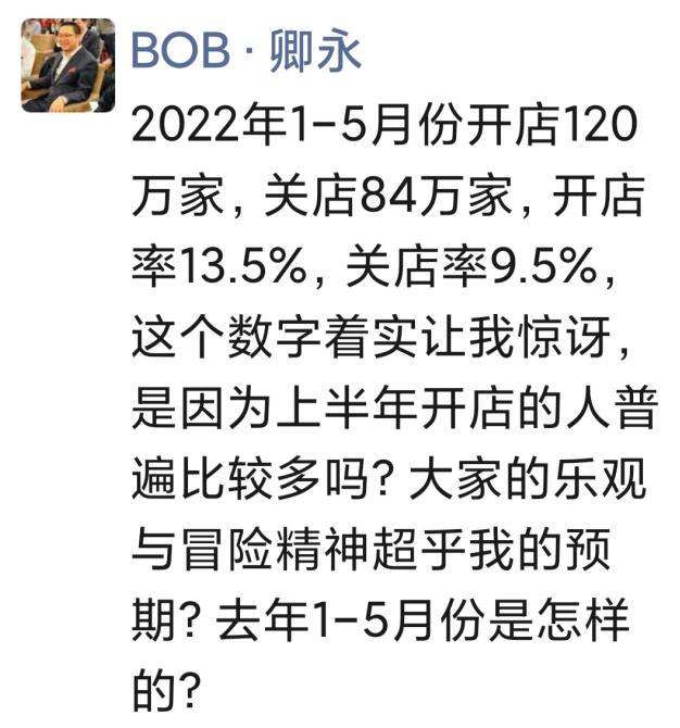 不久前,番茄资本创始人卿永发了个朋友圈,“2022年1-5月份开店120万家,关店84万家,开店率13.5%,关店率9.5%,这个数字着实让我惊讶,是因为上半年开店的人普遍比较多吗?大家的乐观与冒险精神超乎我的预期。”