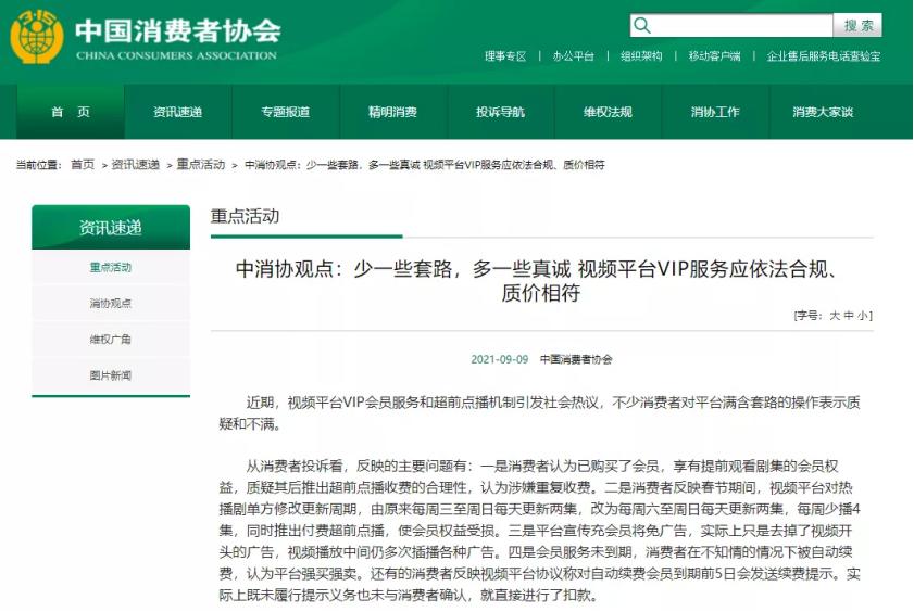 这一改变迅速受到了观众的质疑,并受到了官方点名批评。上海消保委称,所谓“按顺序解锁观看”涉嫌捆绑销售,是对消费者选择权的漠视。紧接着,在去年9月9日,中消协发文“少一些套路,多一些真诚,视频平台VIP服务应依法合规、质价相符”。