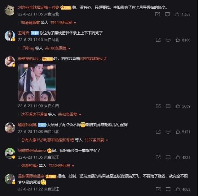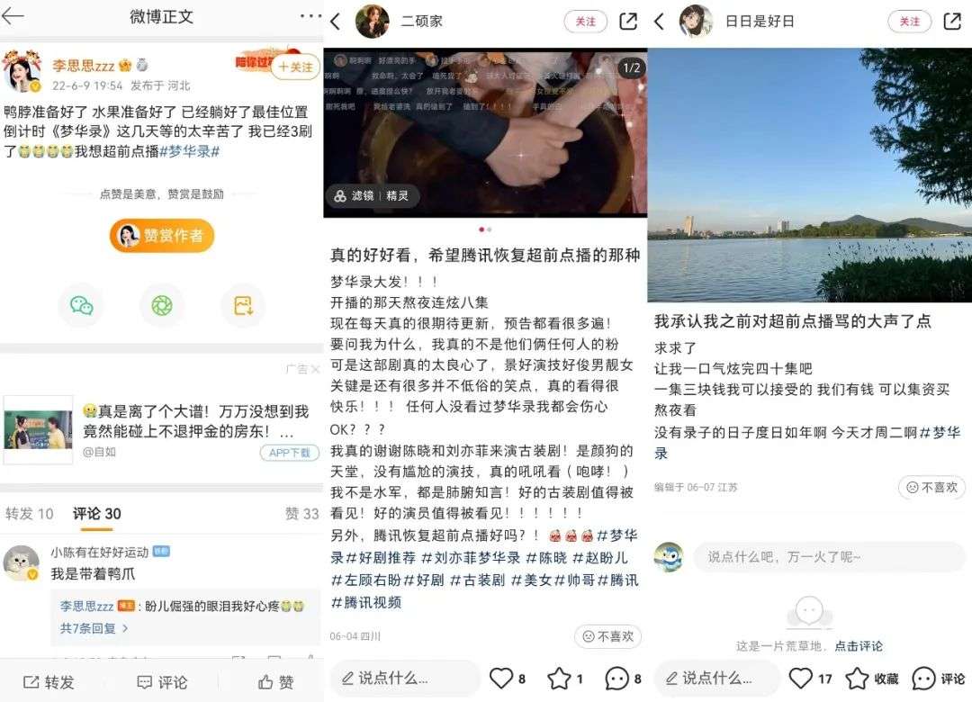有网友发表评论:“鹅,没有心,只想要钱”、“你这为了赚钱把梦华录上上下下薅秃了”,也有粉丝表达了自己的担忧:“拒绝,抵制,超前点播的结果就是盗版资源满天飞,不要为了赚钱,完全不顾梦华录的死活。”