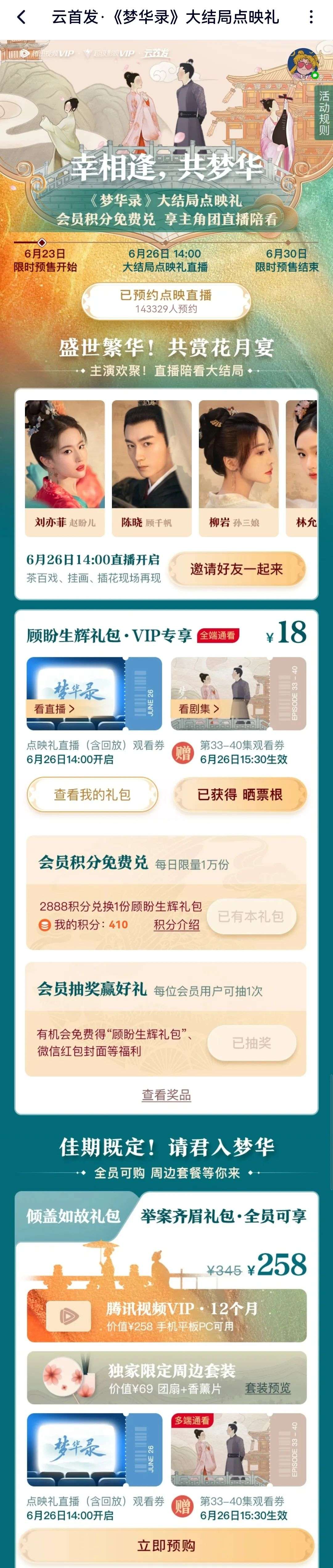 6月23日上午,腾讯视频宣布,电视剧《梦华录》将开启大结局点映礼,观众花费18元即可获得“顾盼生辉”礼包,礼包中包含33-40集大结局提前观看券,以及6月26日的点映礼直播观看券。