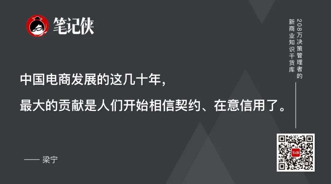 中国电商发展的这几十年,最大的贡献是人们开始相信契约、在意信用了,开始相信不骗人,把信用做好,把产品做好,把服务做好,就能挣钱了,可以让更多人相信好好做事就能持续挣钱了。