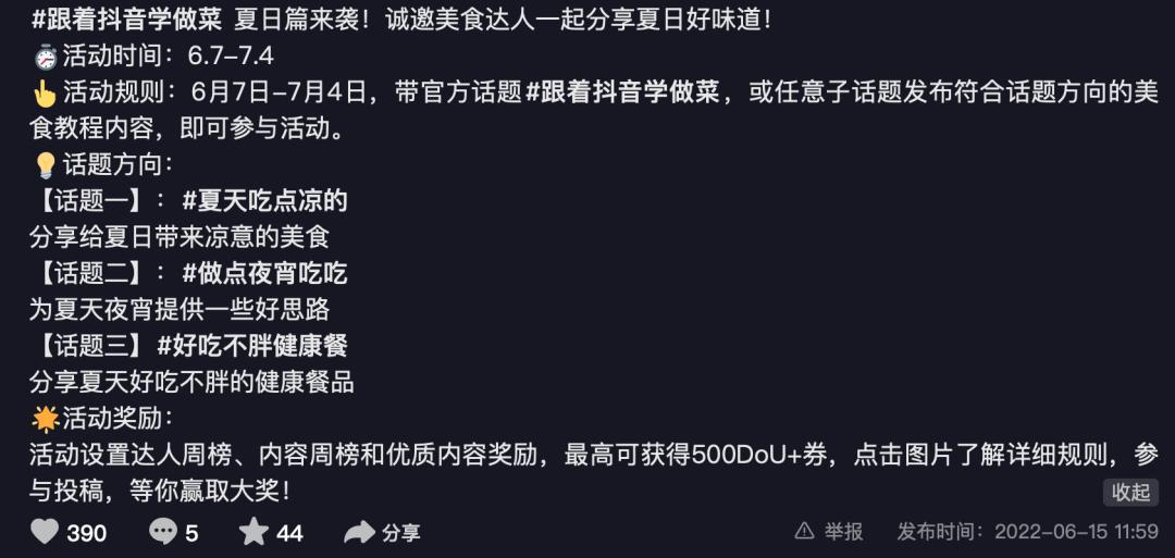 抖音在近期推出了“跟着抖音学做饭”的活动,为创作者提供流量奖励。有博主向Tech星球表示,抖音对于做菜这块的投入并不少,每年都有几次相关的活动,而且依靠这些活动,博主也能够获得更多的流量。获得流量的博主能够迅速成长起来,为抖音进行商业化反哺,比如直播带货、广告变现等。