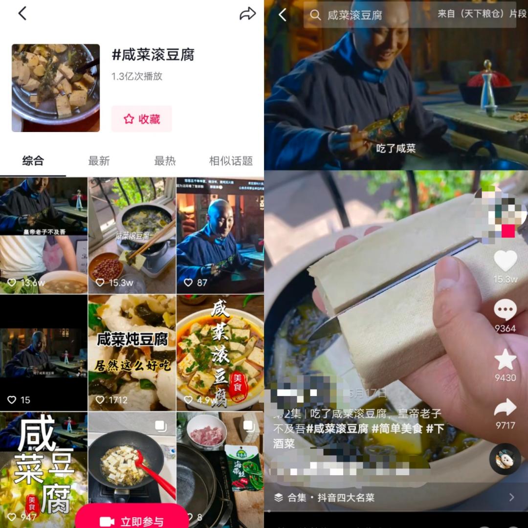 在抖音上,以“咸菜滚豆腐”为话题词的视频播放总量达1.3亿次,此外,抖音上还出现了“鲤鱼焙面”、“蒋侍郎豆腐”和“荔浦芋头”等热门做饭视频,与“咸菜滚豆腐”并称“抖音四大名菜”。