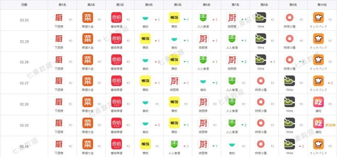 根据七麦数据显示,美食佳饮类App 开启逆袭,在2020年2月底的最后一周,苹果应用商店内的美食佳饮榜中,做饭类产品跻身前十强,超过了饿了么等App,特别是年轻人中使用最多的一款名为“下厨房”的App,曾强势霸榜一段时间。
