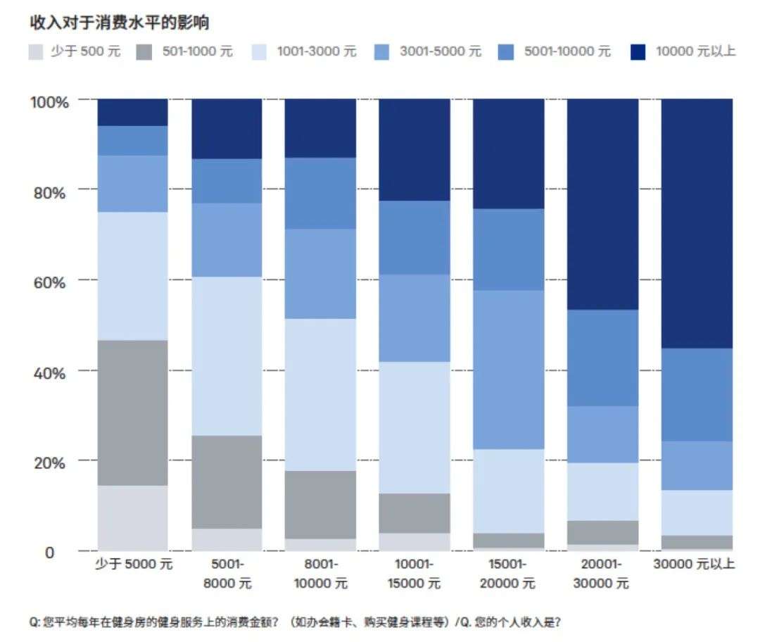 根据精练GymSquare发布的《2022中国健身行业报告》,月薪超过1万5的健身房用户,年健身消费超过3000元的占比大幅度提高(从19.4%到35.1%);而月薪超过2万的健身房用户,年健身消费超过10000元的占比大幅度提高(从24.3%到46.6%)。
