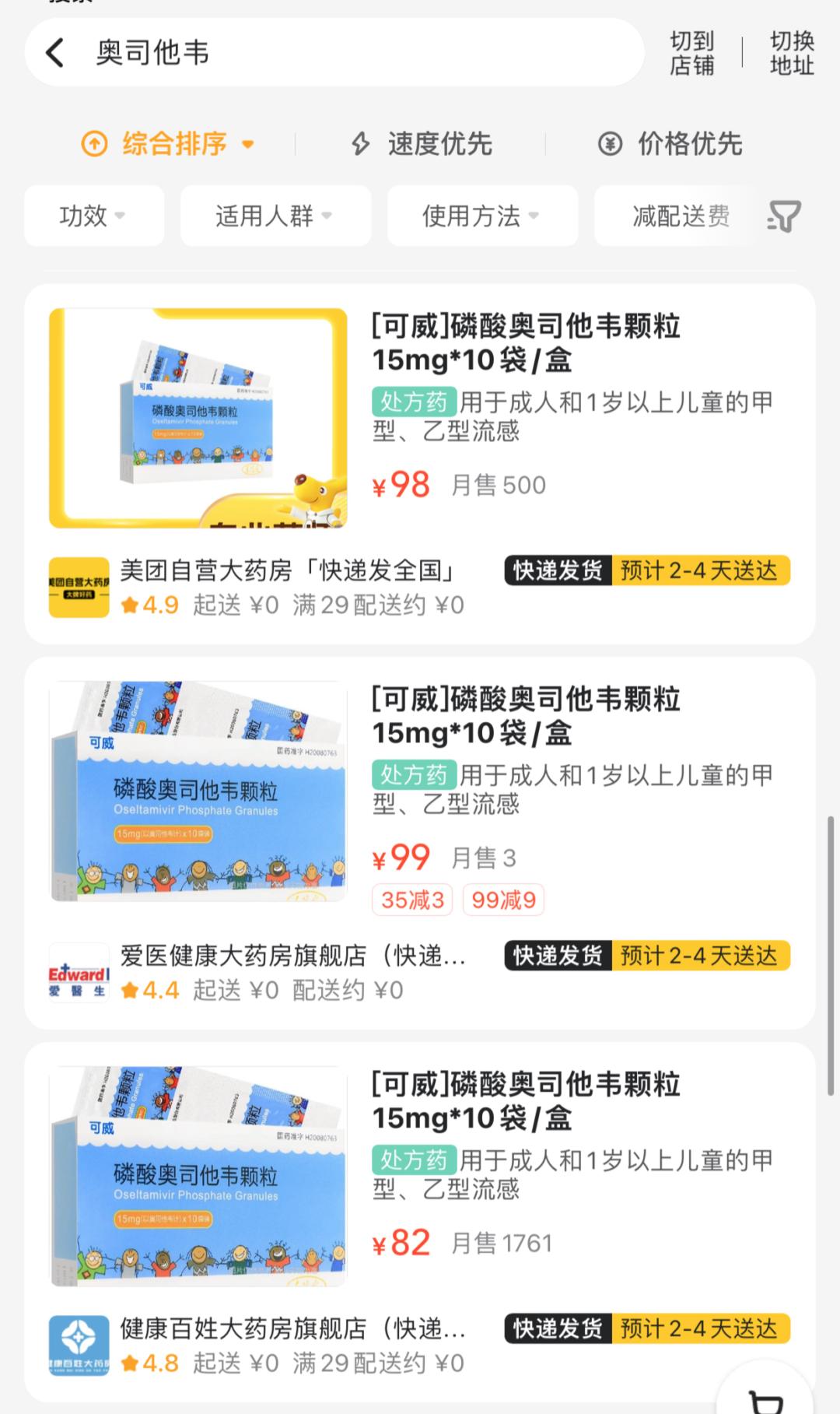 记者在某外卖平台将地址设置为福州后,搜索奥司他韦,均显示需快递发货,2至4天送达。将地址设置为广州后,也显示只有个别药店有奥司他韦原研药“达菲”在售,国产药物“可威”等也需要快递发货。