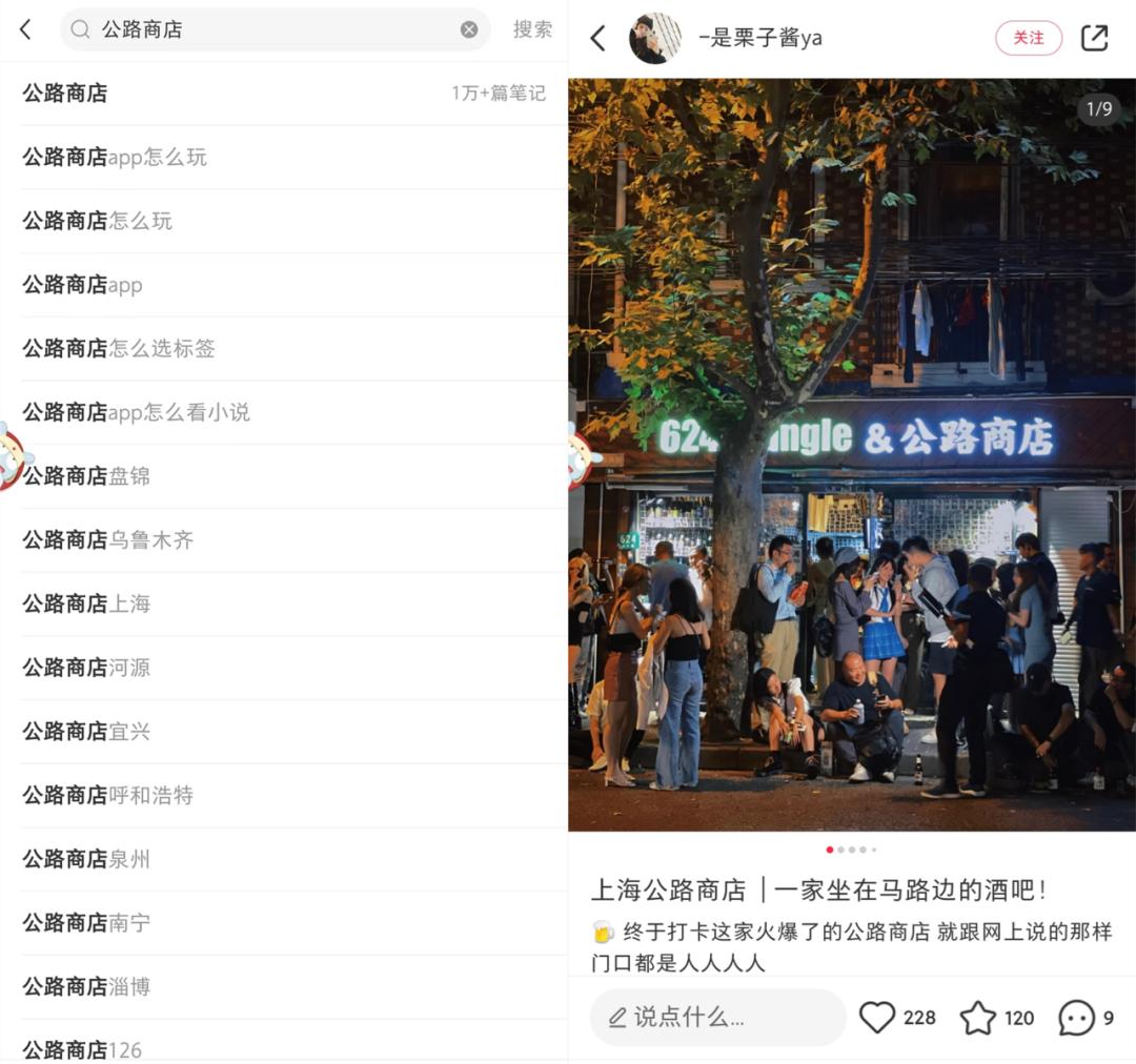 如果你在小红书上搜索“公路商店”,可以发现1W+的笔记和无数上头安利。提及公众号的寥寥无几,倒是“公路商店”酒吧成了实打实的网红打卡点。