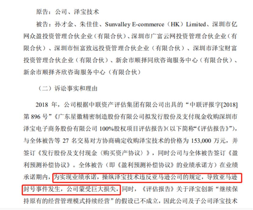 在公告中,泽宝及母公司指称,包括孙才金在内的全体被告,为了实现对赌目标,操纵泽宝技术违反亚马逊的规定,导致亚马逊封号事件发生,公司蒙受巨大损失。