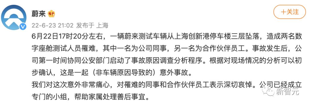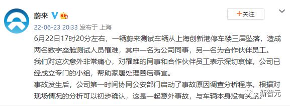 6月22日17时20分左右,一辆蔚来测试车辆从上海创新港停车楼三层坠落,造成两名数字座舱测试人员罹难,其中一名为公司同事,