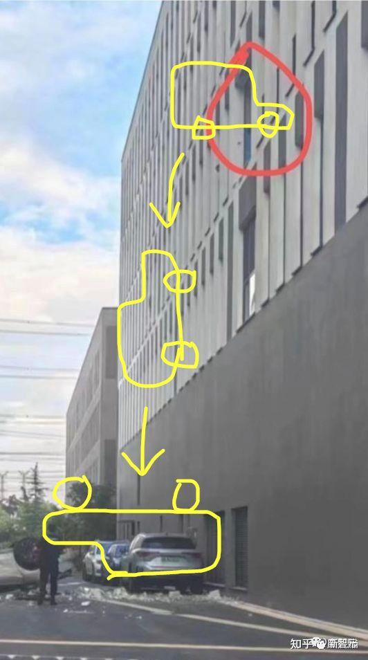 车头落地后朝外,通过这个方向大致可以确定冲破墙体时车辆的方向。也就是说,这台车在冲出大楼之前,是车尾朝外的状态。