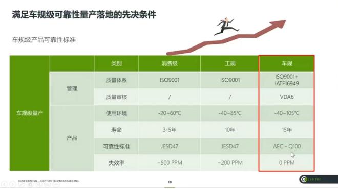 根据应用场景,激光雷达一般分为三种级别,即消费级、工规级和车规级。其中车规级的要求最高。比如,车规级的激光雷达需要满足-40~105℃的使用环境,15年的使用寿命,0 PPM(每百万份中的一份)的失效率等苛刻条件。