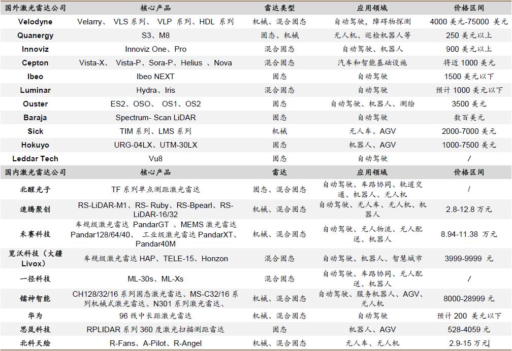 激光雷达主要厂商核心产品情况,资料来源:各公司官网、德邦研究所