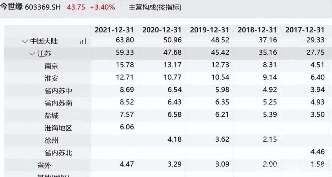 在圈内人看来,今世缘这家二线白酒头部公司,多年来90%以上营收都来自江苏本地,外省收入不足7%,占比太低,因此,不要说与茅五泸这样的全国性名酒相比,就是与洋河、汾酒、古井贡等营收百亿以上的品牌相比,今世缘都只能算是江苏地产名酒,20多年来始终没能真正走出省外。