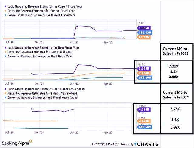 Lucid 的市销率在样本中并不是最高的,但是当我们将公司当前的市值与 2023 财年和 2024 财年的估计销售额相匹配时,我们发现 LCID 的高估不合理,即使与其他高估的公司相比也是如此: