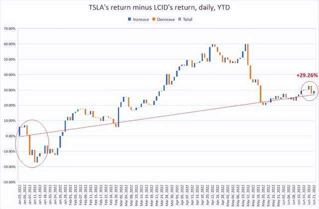 如果潜在投资者从 2022 年初开始实施这一策略,那么截止现在这种套利(多头 TSLA 与空头 LCID)今天将产生近 30% 的回报(5 月中旬达到约 60% 的峰值)——要好得多高于标准普尔 500 指数(年初至今 -21.51%)。