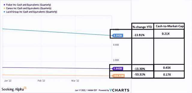 其次,Lucid 消耗的现金与 Fisker 差不多,但其风险状况(基于资产负债表上的现金与市值的比率)与 Canoo 相似,Canoo 是该集团中分析过的最小的公司: