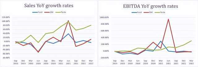 当我们随着时间的推移观察公司的运营业绩时,我们发现特斯拉的增长比老牌汽车制造商要稳定得多。