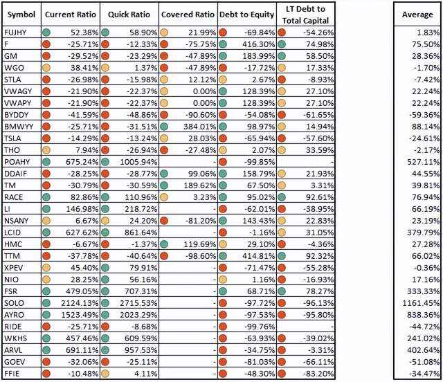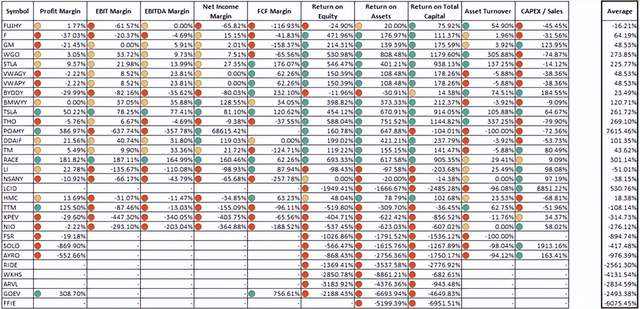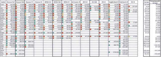 点表示与中值的偏差。如果偏差大于 50%,则颜色为绿色。如果偏差在 0% 到 50% 的范围内,则颜色为黄色。负偏差用红色标记。最右边的列是每个公司数据行的平均值。