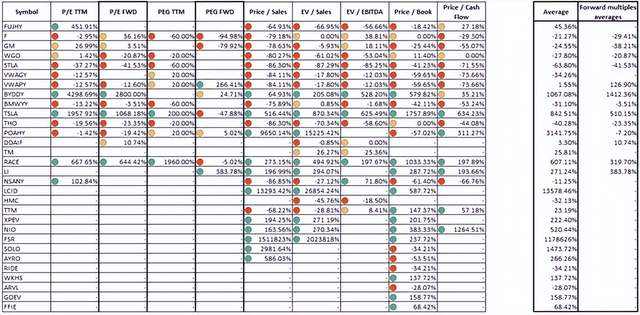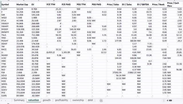 首先,上述所有公司显然都具有很高的价值。正如与行业中值的比较所示。但就 EV/EBITDA (FWD) 估值指标而言,市值超过 250 亿美元的 Lucid Group 似乎是最昂贵的: