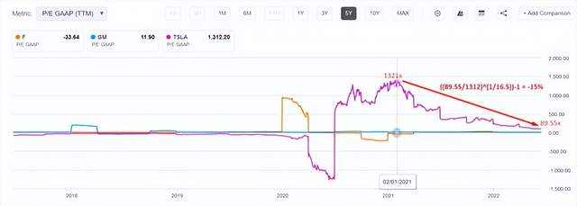 此外,在过去的 16.5 个月里,市场将特斯拉的市盈率(TTM)从 1312 倍降至 89.55 倍(当时股价本身仅下跌了 21%)——也就是说,得益于强劲的盈利增长,公司的 TTM 倍数每月下降约 15%。