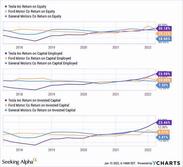 流动性和偿债率也显示了公司在行业中的优势——在快速增长的公司在基础设施扩张上花费大量资金的背景下,福特已经具备了必要的生产能力,因此公司的资本支出减少了,尽管下降了利润率,福特的业务产生的资本投资回报率远高于大多数其他同行。