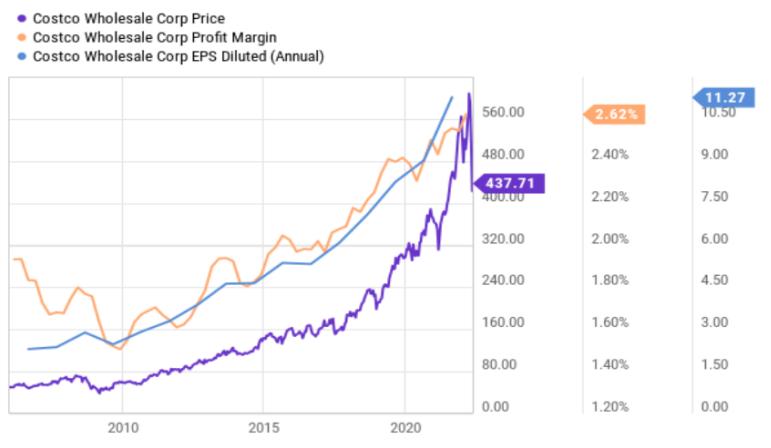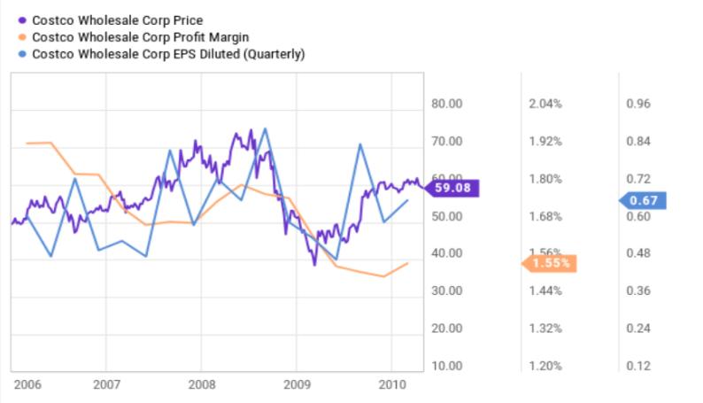 2006至2010年Costco股价、净利率、EPS走势(来源:SeekingAlpha,YCharts,下同)