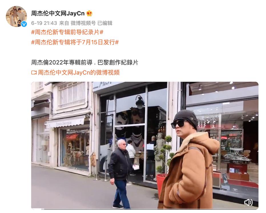 6月19日,周杰伦在个人社交账号发布新专辑的前导纪录片,并在片尾预告:新专辑将于7月15日发行。随后,与周杰伦相关五个词条接连登陆微博热搜榜,“杰迷过年了”话题一度登上微博文娱榜榜首。