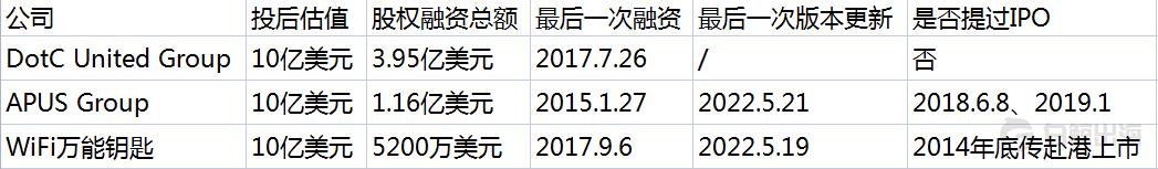 其中,酷量科技在 2016-2017 年进行了三次融资,共筹集了 3.95 亿美元;APUS 只在 2014 和2015 年进行两次融资,拿到 1.16 亿美元;WiFi 万能钥匙在 2008、2015、2017 年分别有三次融资,共融资 5200 万美元。其中 APUS 和 WiFi 万能钥匙有过或者传出过 IPO 计划,但是后来也没有了下文。