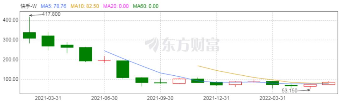 我们回看短视频第一股快手上市时,市场当时给了非常积极的反馈。2021 年 2 月 5 日,快手在中国香港联交所主板正式上市,首日在港交所开盘上涨 193.913%,报 338 港元,成交量 92.422 亿元,总市值 1.39 万亿港元。但经过一年之后,从 338 港元一路跌到了如今的 87 港元,大约跌去了 75%。