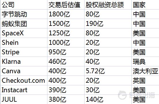 在榜上全球 1300 多家公司中,中国公司共占据了 242 家(可能会随更新波动),在数量上占总榜的 18.3%,仅次于美国。其中,全球 TOP10 独角兽为(单位:美元):