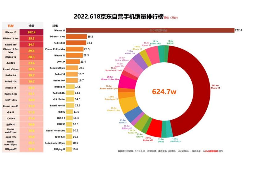 不仅在刚刚过去的 618 京东自营机型销量排行榜中以碾压第二红米 K50 超 8 倍之多的销量斩获第一。
