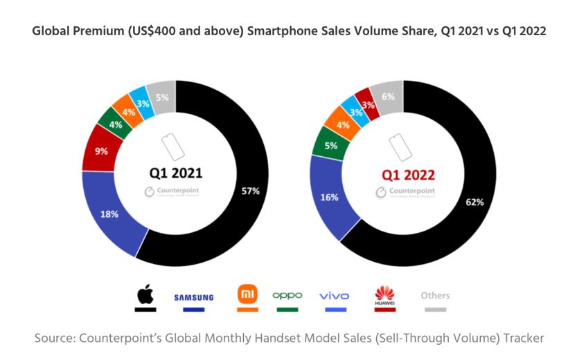 还在 2022 年 Q1 全球高端手机市场中占据了 62% 的份额。