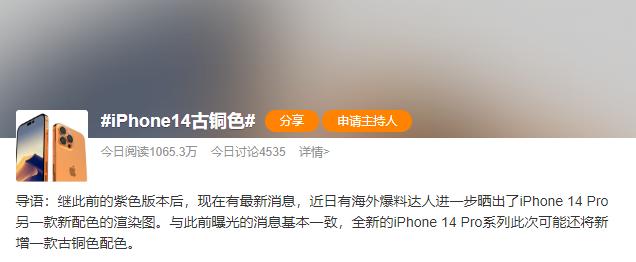 就在昨晚,继上一次 iPhone 14 Pro 新配色紫色后, #iPhone 14古铜色# 新配色这个话题就又一次被推上了热搜。