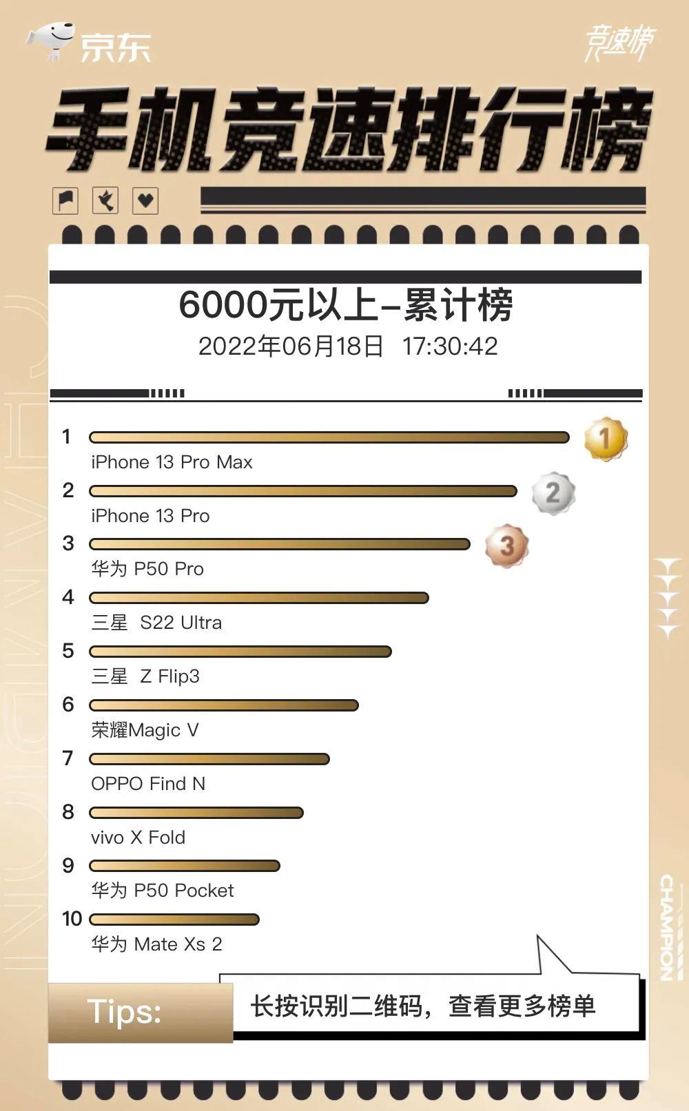 在今年京东618高端手机(6000元以上)排行榜上,除了华为之外,荣耀Magic V、OPPO Find N和vivo X Fold赫然在列,位列第七、第八和第九。