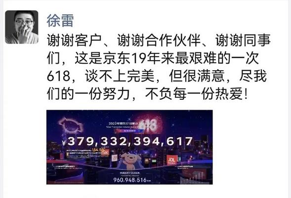 今年“618”刚落幕,京东CEO徐雷发了一条朋友圈,称今年的618是京东19年来最艰难的一次,谈不上完美,但很满意。