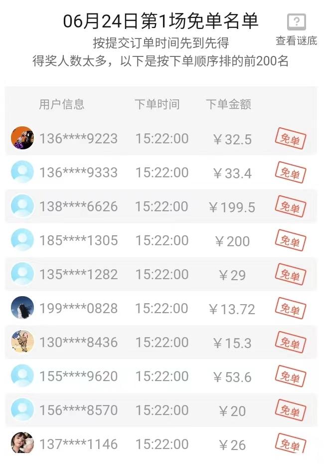 猜中时间的订单,也可能因为排序靠后或者不符合其他条件而最终未获得免单;猜错时间的用户,也只能吃下美食,蜂拥在社交媒体上发布一条“赌狗赌狗,赌到最后一无所有”的动态。