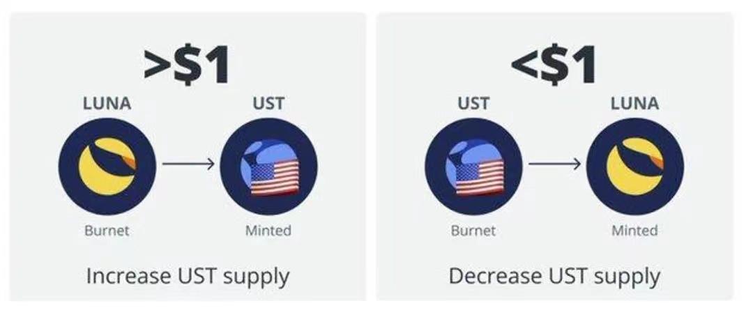 想象很美好现实很残酷。Terra设计了几个规则:1. 一个 UST=价值1美元的Luna。UST 是基于算法的去中心化美元稳定币,与USDT、USDC不同。意思是,如果Luna价格为1美元可以换一个UST,如果Luna价格涨到了100美元,则可以换100个UST。2. UST和Luna是“双向销毁铸造”的关系。意思是,当你在用Luna换UST时,市场上就少了一美元的Luna多了一个UST,当用UST换Luna时,市场上就少了一个UST。