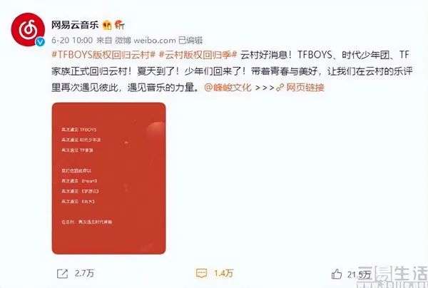 在独家版权无法成为在线音乐平台市场竞争的武器后,作为这一赛道“二哥”的网易云音乐,无疑是最喜闻乐见的。并且在这随后的一年时间以来,曾经失落的音乐版权也陆续回归“云村”。日前,网易云音乐在与韩国SM娱乐公司达成合作后,宣布获得了时代峰峻旗下TFBOYS、时代少年团、TF家族的相关音乐版权。