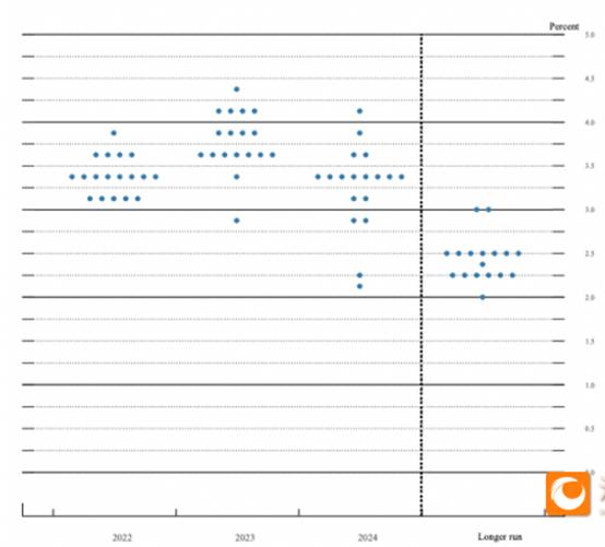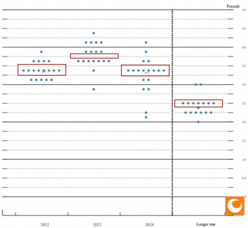 三月会议预测的2023年中位数在2.75,相比2022年的预测,需要加息75~100个基点,利率的拐点(即最后一次加息期间)将出现在2023~2024年。