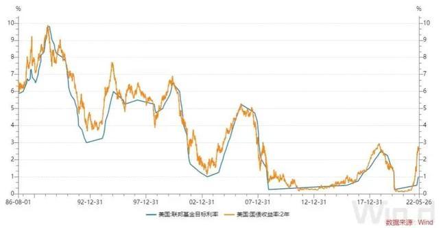 这个周期是一个人为调节的逆周期,下图为美国联邦基金和与之相关的两年期国债利率,它的背后是宏观经济过热与过冷,也是一个周期现象,这也导致股市周期性——牛熊交替。