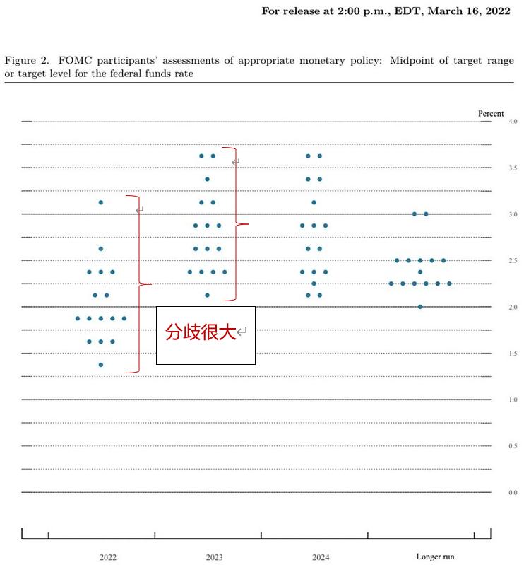 回头再看三月点阵图对2022年的预测,有一个明显的特点:分歧非常大,最高的在3~3.5%,最低的1.25~1.5%,高低相差175个基点,这么大的分歧,是近几年少有的。