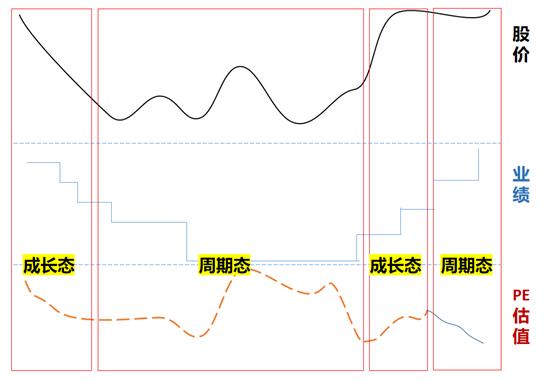 这两种互逆的特性当然不可能同时出现,而是出现在不同阶段:在周期上行期和下行期,股价与估值的关系呈“成长态”,在周期的繁荣顶点期和周期的低谷期,呈“周期态”。