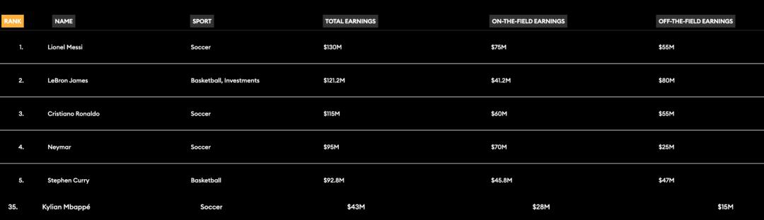 在年收入上面,两者的差距更大。在福布斯发布的2022全球最高收入排行榜当中,詹姆斯以1.21亿美元排在次席,而姆巴佩则以4300万美元排在第35位,差距显而易见。尤其是在场外的收入方面,詹姆斯可谓是碾压的姿态胜出(8000万美元VS1500万美元)。